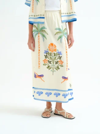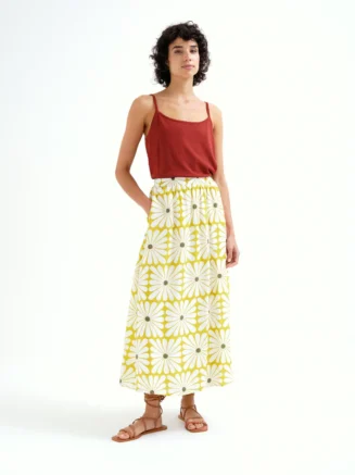 Falda midi con estampado floral Nenufar. Con cintura fija frontal y elástica trasera de tiro medio. Bolsillos laterales.