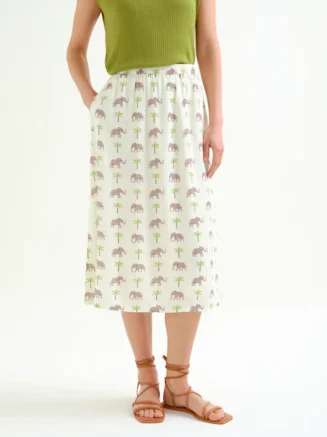 Falda de tejido rayon lenzing ecovero con estampado de elefante. Cintura elástica de tiro medio. Bolsillos laterales. Forro interior