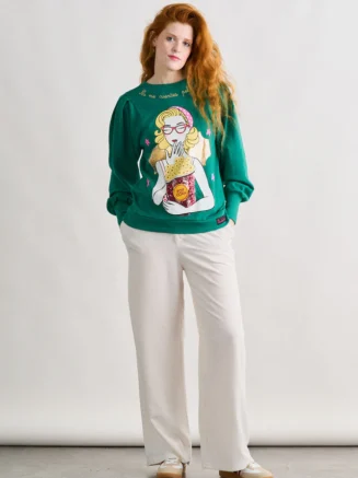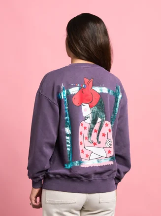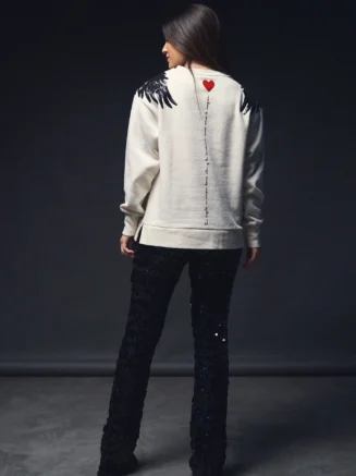 Cómoda y suave, cuenta con mangas largas acabadas en puño rib y cuello redondo clásico. Pero lo que realmente la hace brillar es su maxi estampado delantero y trasero, con detalles espectaculares en foil metálico que capturan la luz y multiplican su impacto.