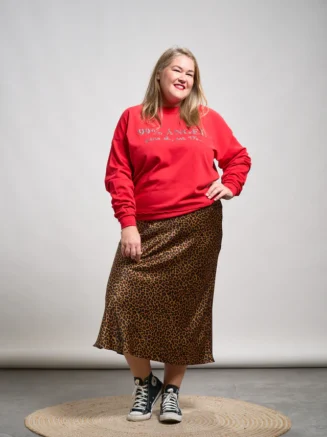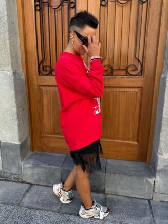 Sudadera over roja, más larga por detrás, estampado ilustraciones rosas