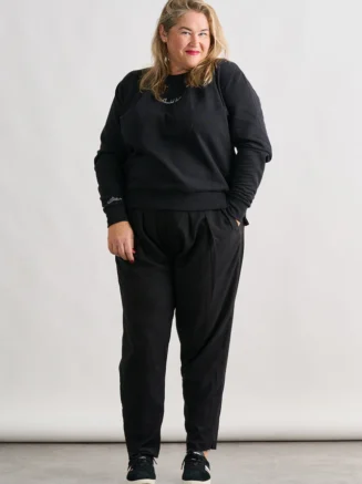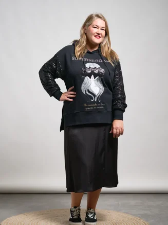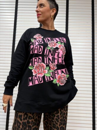 Sudadera larga negra, con aberturas laterales y estampado rosas
