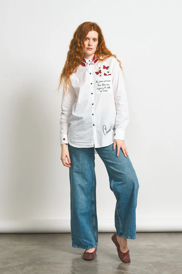 – Bolsillo de plastón en parte delantera con frase estampada y mariposas bordadas sobre bolsillo.