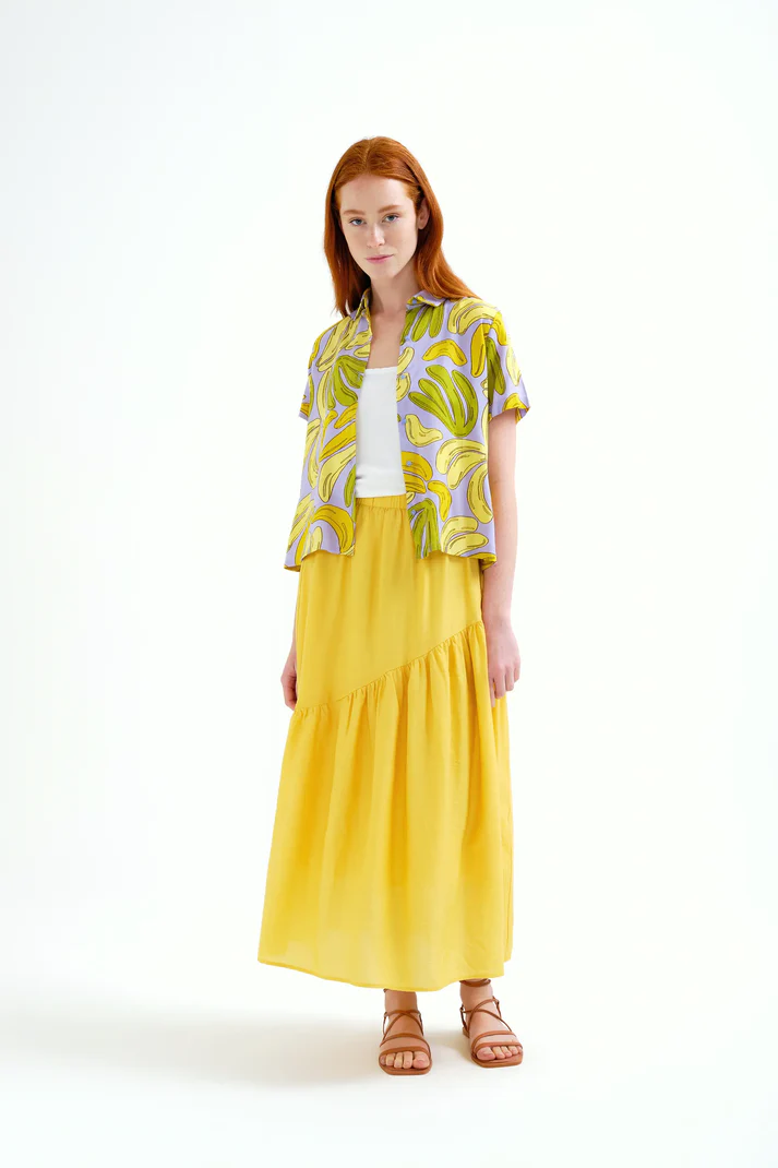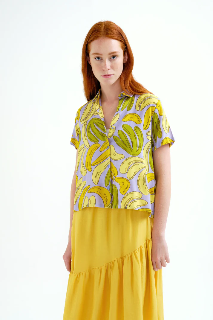 Camisa con tejido estampado guineo. Cuello solapa y manga corta. Cierre frontal con botones de color amarillo