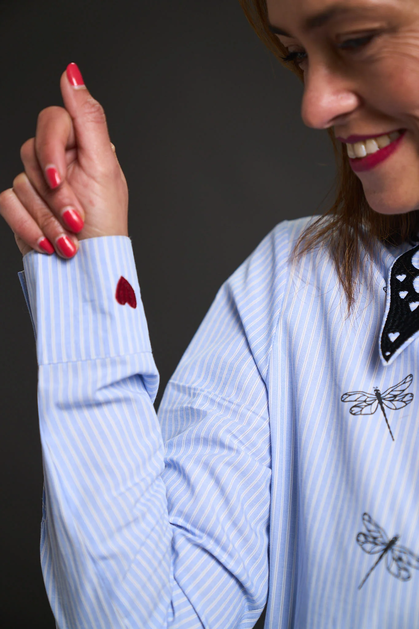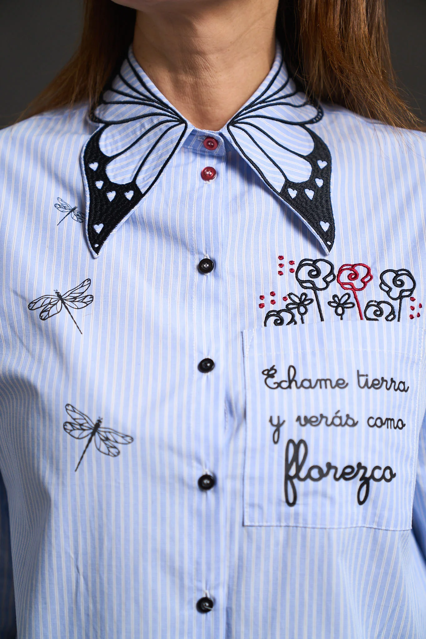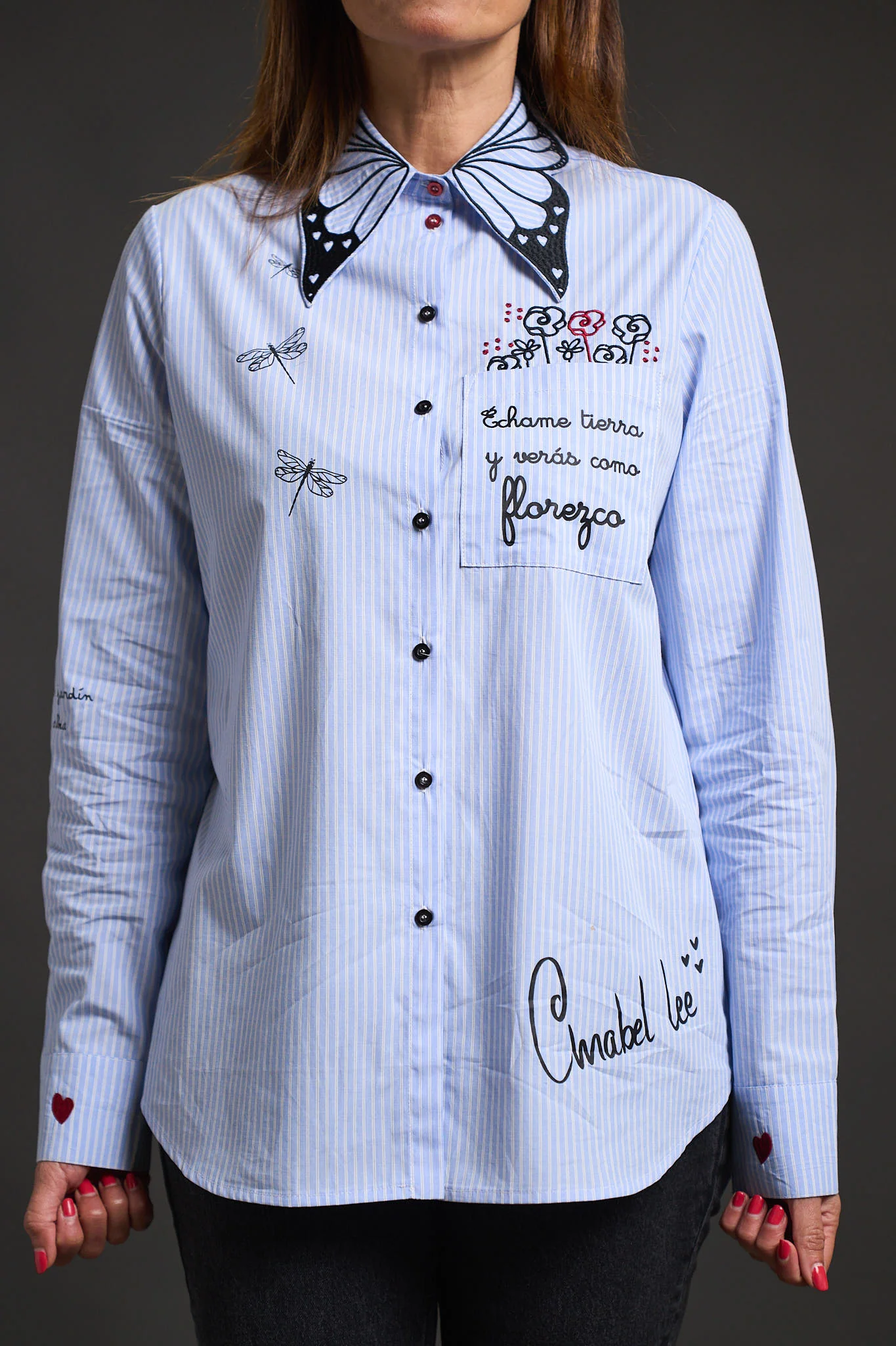 – Detalle de filigranas bordadas en cuello, corazones bordados en puños y print del logo sobre camisa.