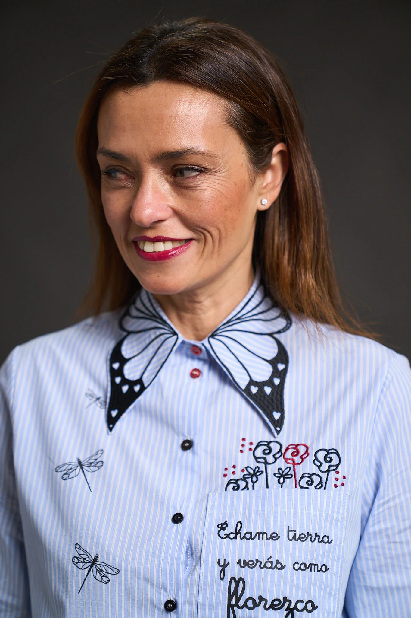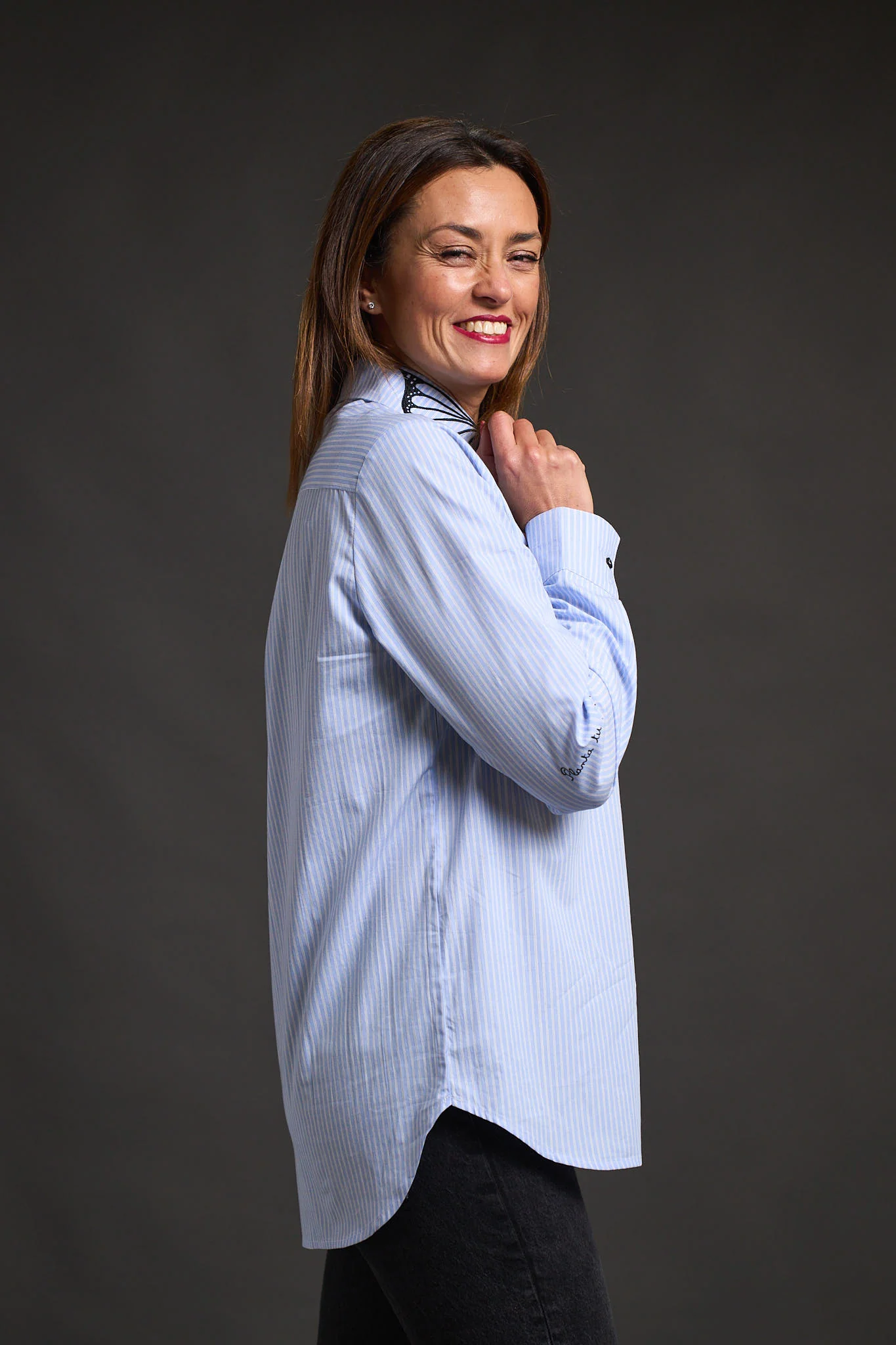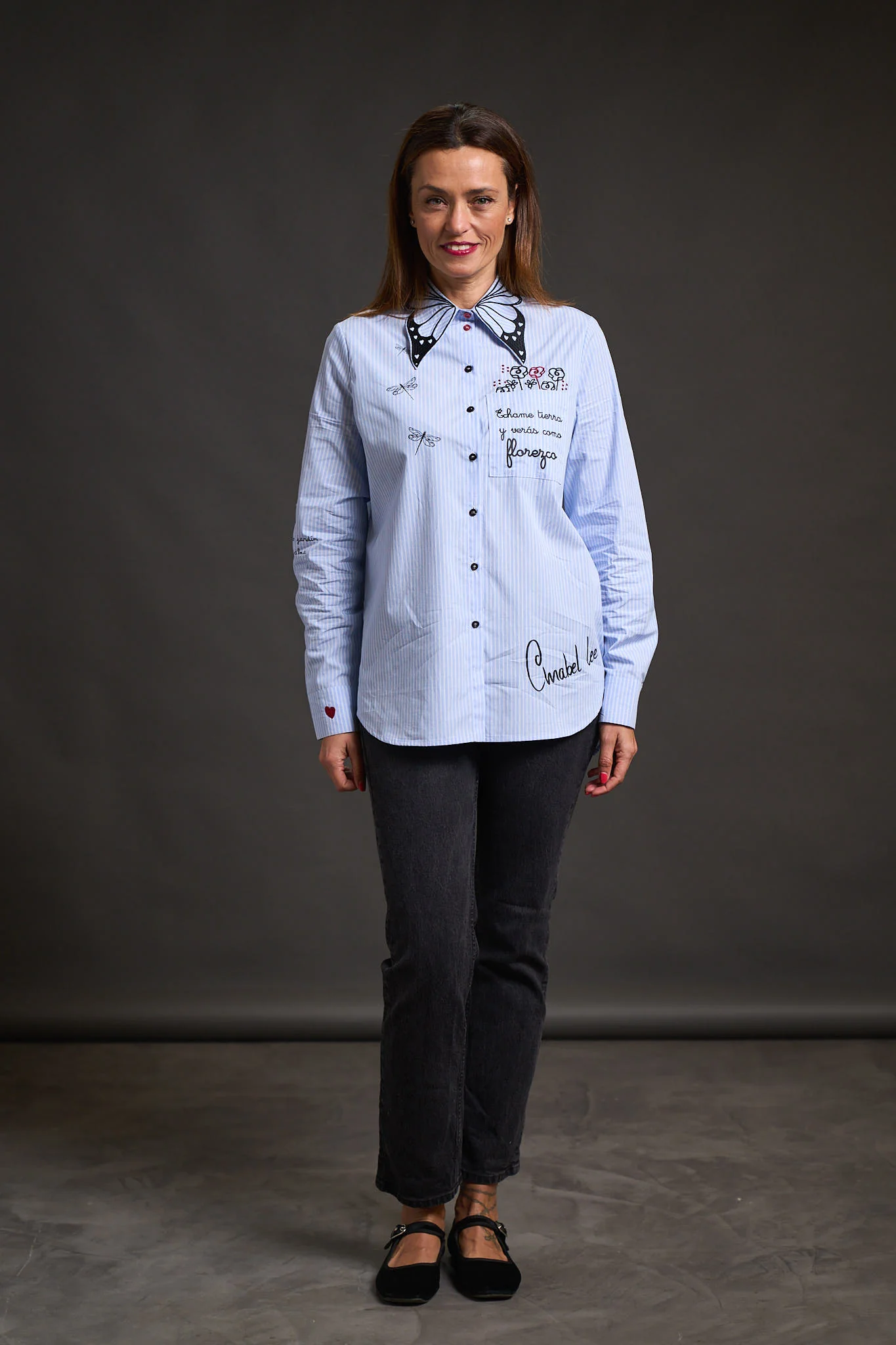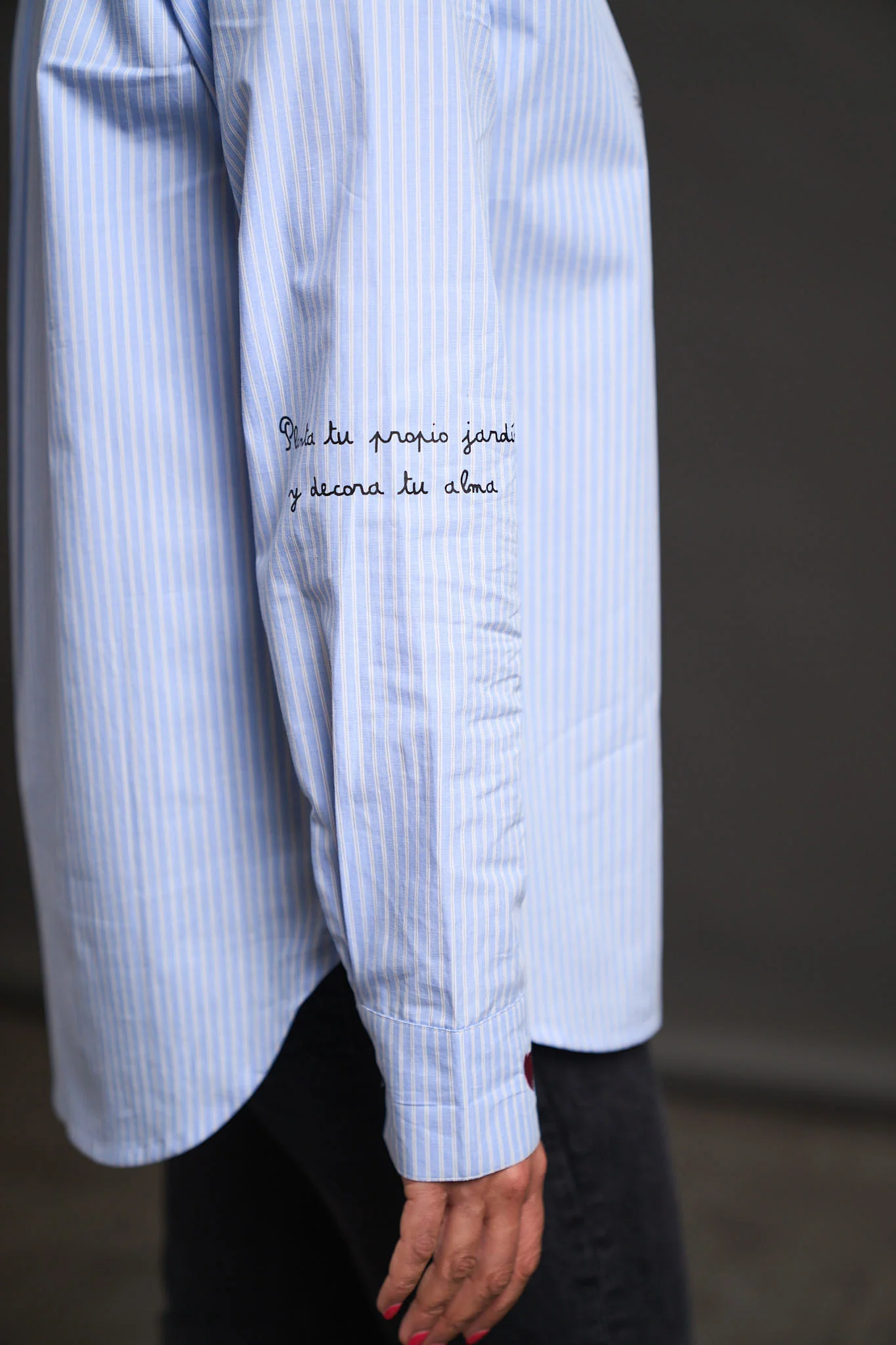– Detalle de filigranas bordadas en cuello, corazones bordados en puños y print del logo sobre camisa.