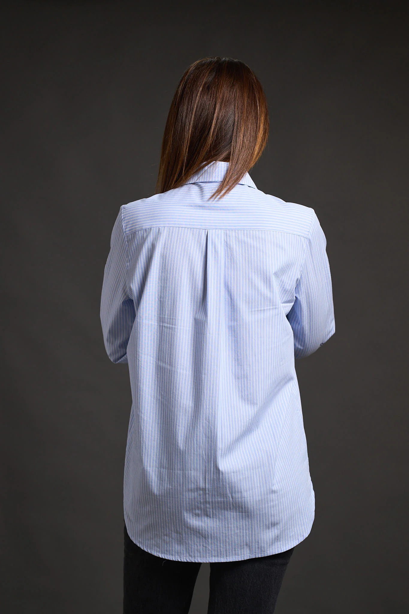 – Camisa de rayas de corte recto, cuello camisero con tirilla, manga larga con puño y cierre de botón.