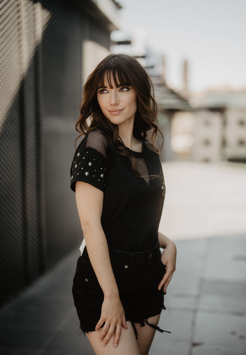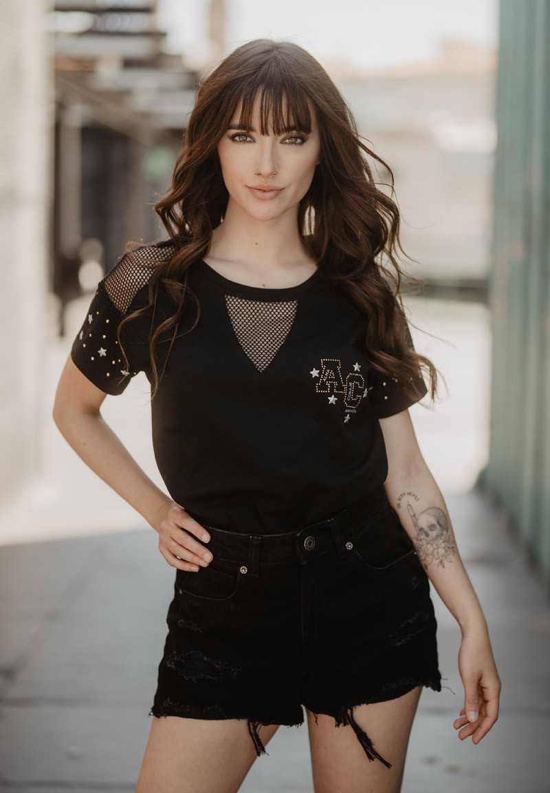 Camiseta con rejilla en los hombros y el escote, pequeñas tachuelas doradas y estrellas plateadas en las mangas.