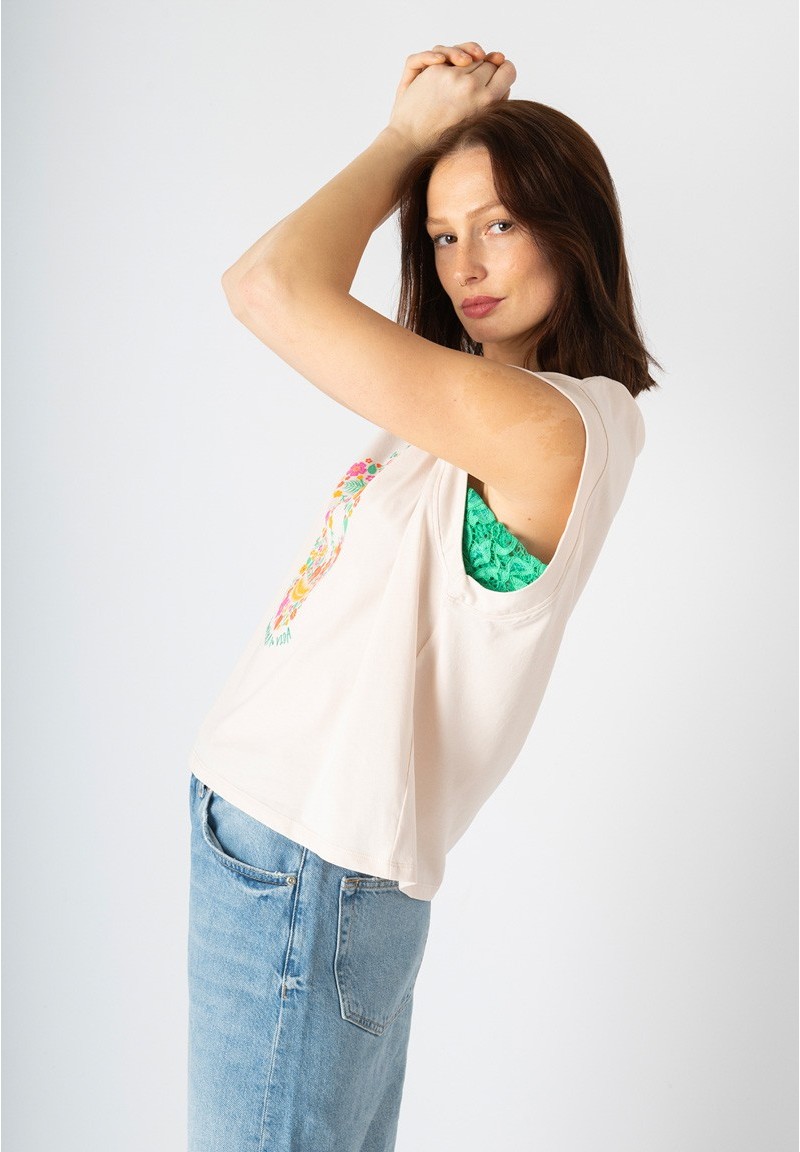 Camiseta de sisa baja con triángulo de encaje verde. El diseño representa una calavera formada por pequeñas flores, sobre ellas, la frase bordada “Lo que consume tu mente controla tu vida”