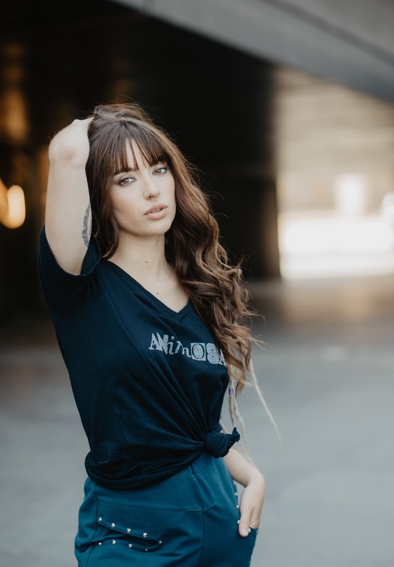 Camiseta de corte oversize y cuello de pico. En el pecho, la palabra Animosa en caviar irisado en una tipografía estilo punk.