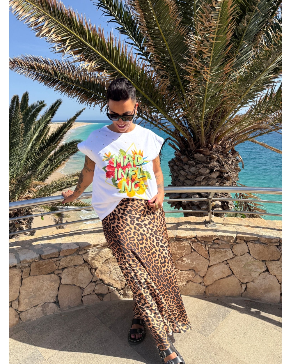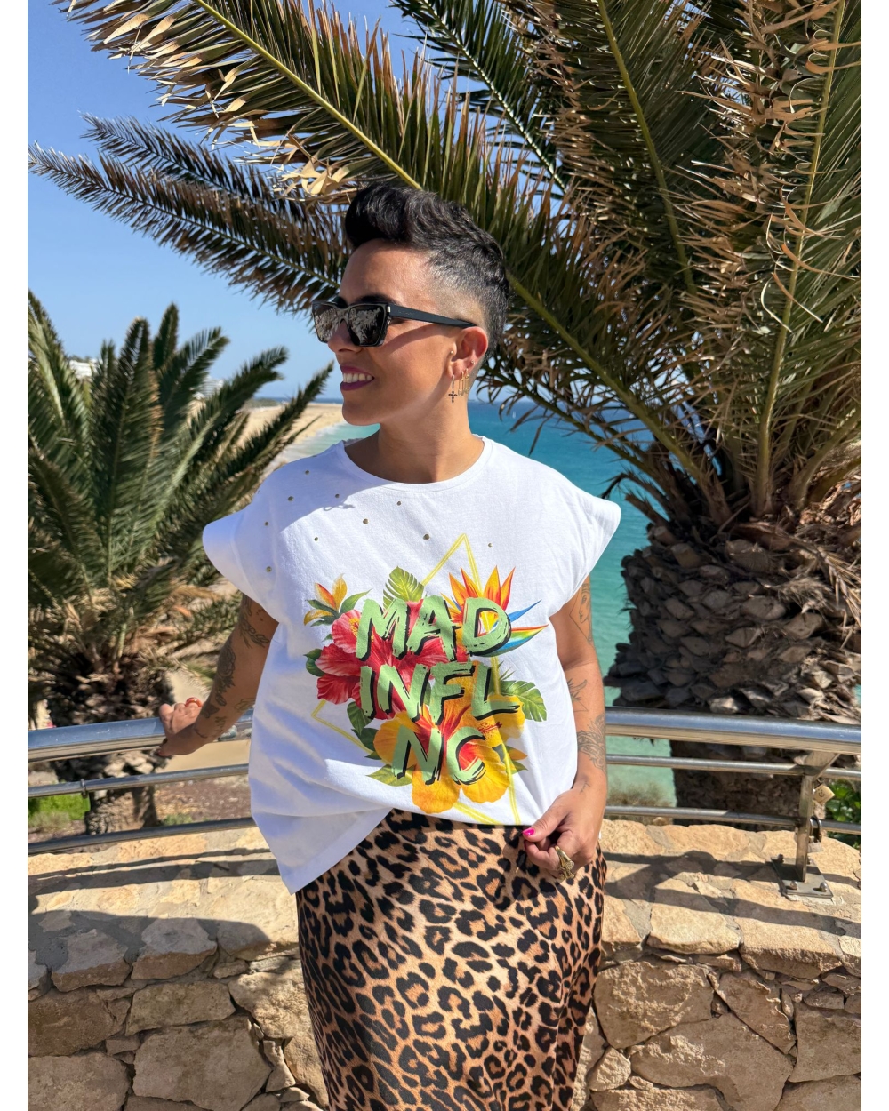 Camiseta evasé, con detalle en manga para efecto manga corta y tachas. Ilustración tropical