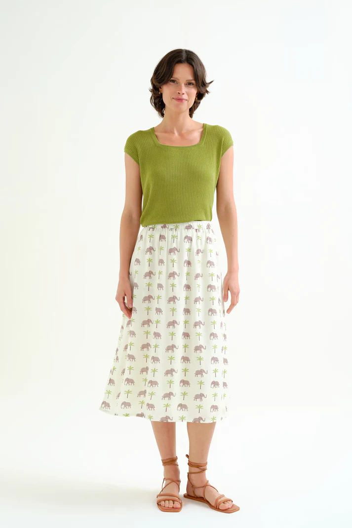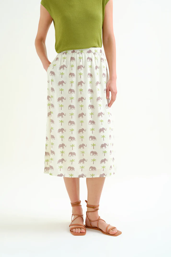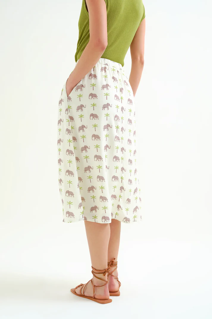 Falda de tejido rayon lenzing ecovero con estampado de elefante. Cintura elástica de tiro medio. Bolsillos laterales. Forro interior