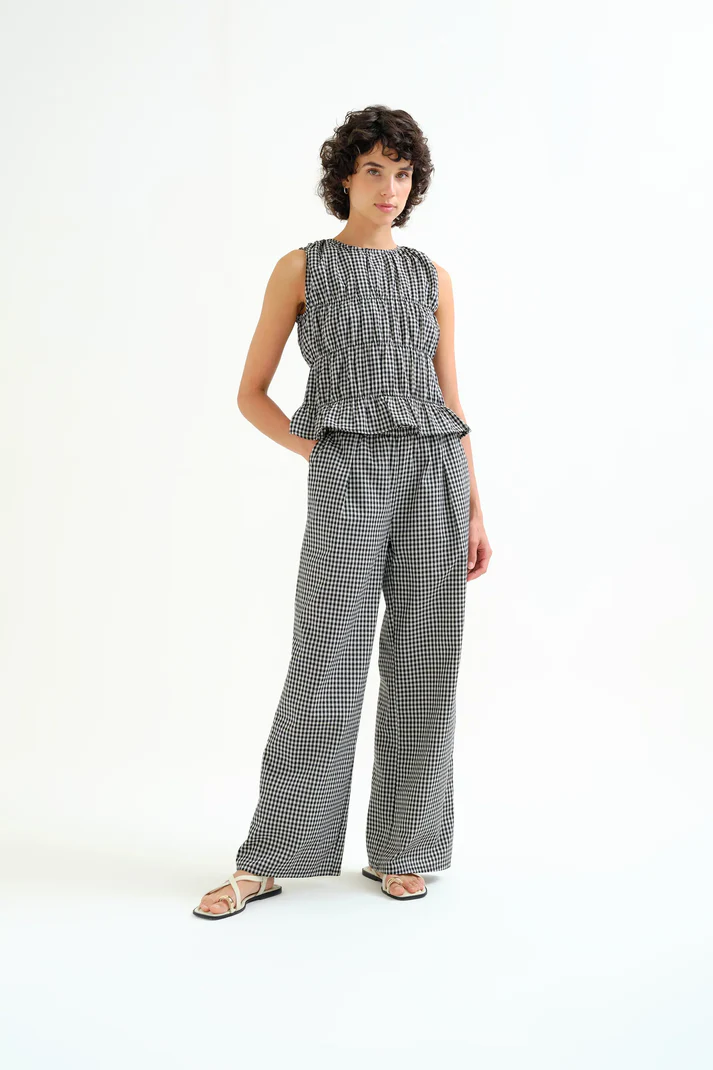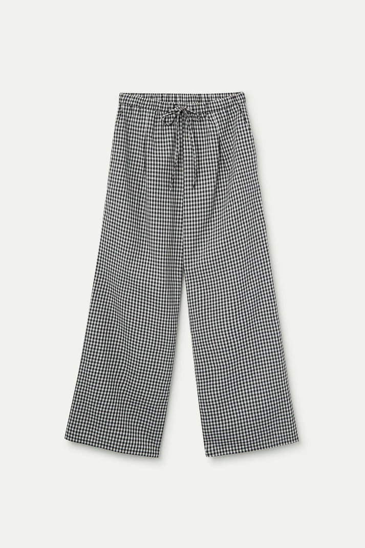 Pantalón de tejido 80% algodón vichy de color negro. Cintura elástica de tiro medio y ajuste con cordones. Pernera recta. Bolsillos laterales.