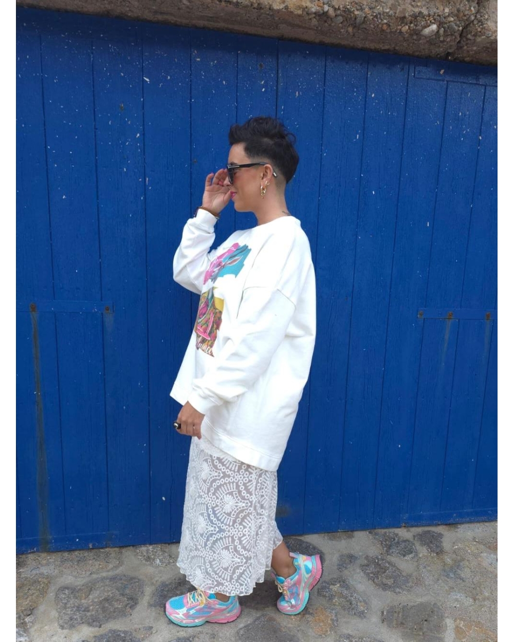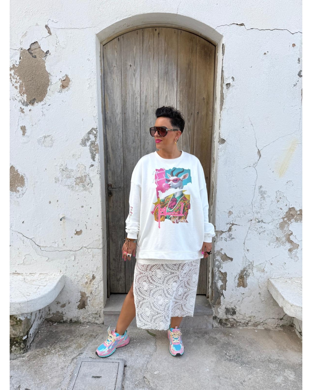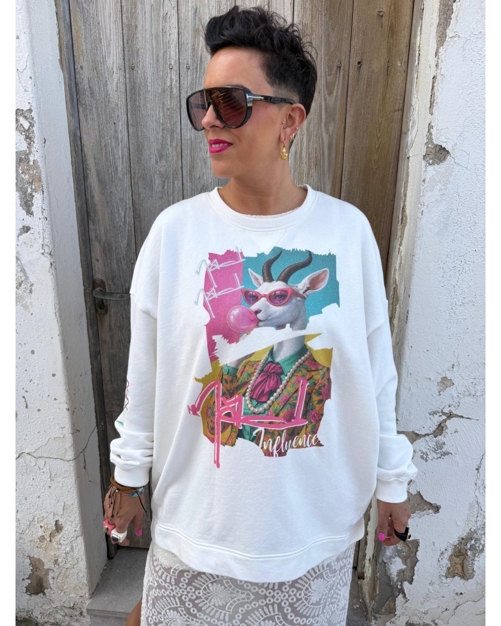 Sudadera oversized, más larga por detrás, color blanca, detalles estampado ilustración cabra y bordado manga rayo.