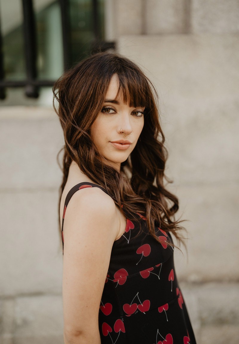 Vestido largo de tul, fruncido en el pecho y entallado en la cintura, fada evasé. Las cerezas simbolizan buena suerte y, al crecer en pares, las conectamos con la amistad inseparable. Lo dijo Emily Dickinson: “todo mi patrimonio son mis amigas”.