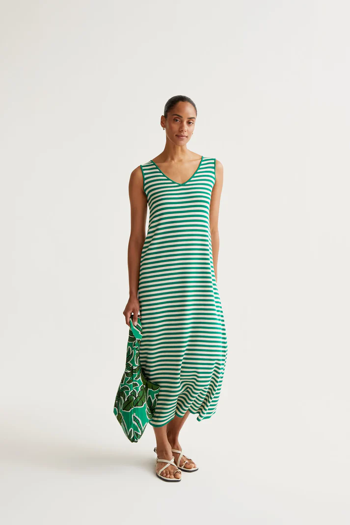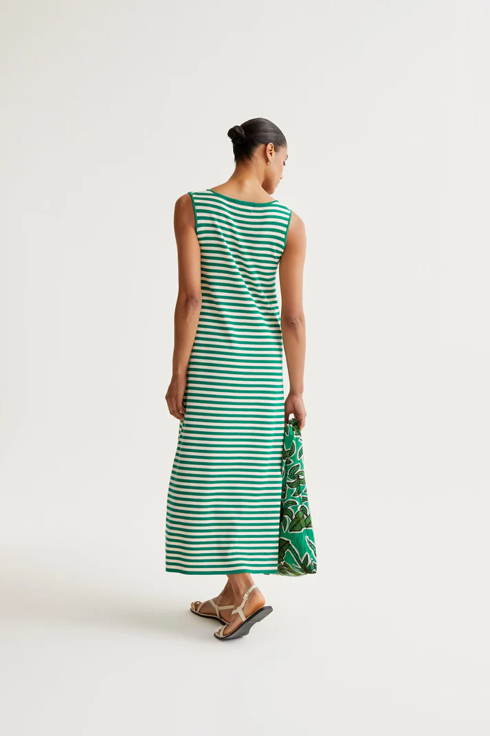 Vestido largo con tejido de punto estampado de rayas de color blanco y verde. Escote pico y sin mangas. Corte fluido. Detalles acabados en rib.
