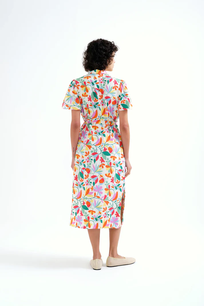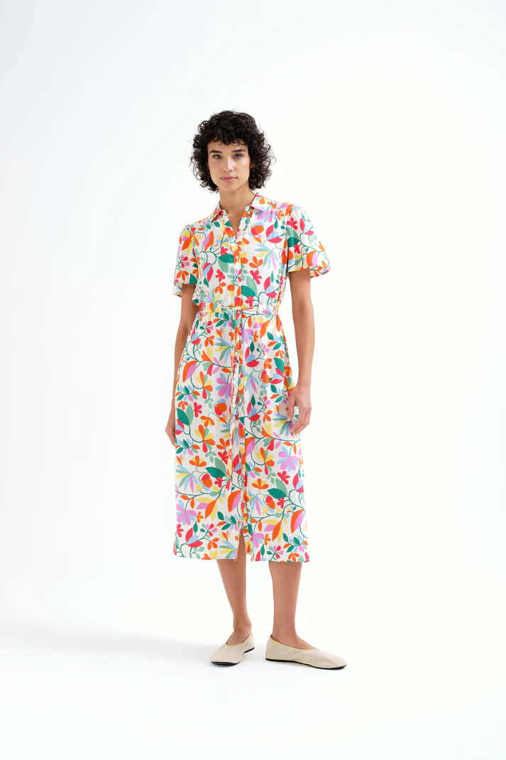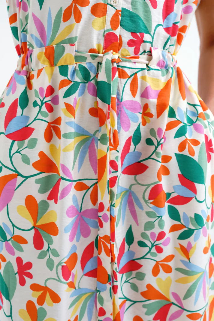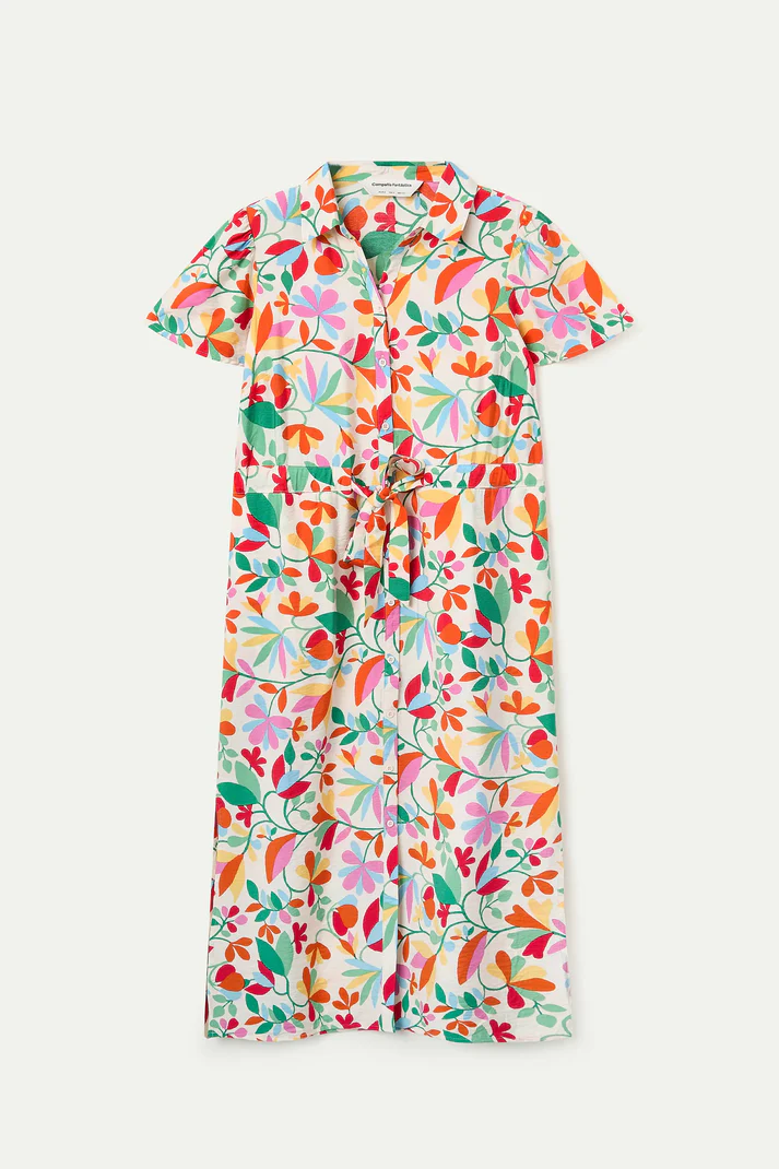 Vestido midi de tejido crepé con estampado lotto. Cuello solapa y manga corta. Cierre frontal con botones de color blanco. Detalle de ajuste con cordones en la cintura.Bolsillos laterales.